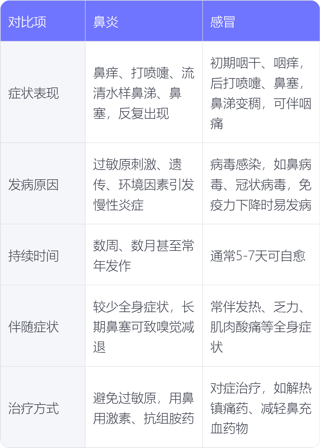 1. 症状表现:鼻炎主要症状为鼻痒、打喷嚏、流清水样鼻涕、鼻塞等,症状相对较为固定且反复出现;感冒初期多有咽干、咽痒或烧灼感,随后出现打喷嚏、鼻塞、流清水样鼻涕,2 - 3天后鼻涕变稠,可伴有咽痛、头痛等。
