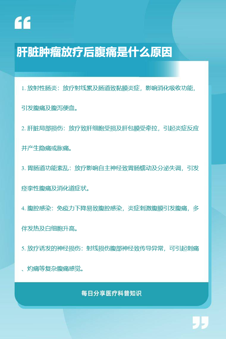 肝脏肿瘤放疗后腹痛的原因包括放射性肠炎、肝脏局部损伤、胃肠道功能紊乱、腹腔感染、放疗诱发的神经损伤等。