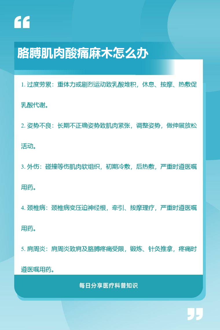 胳膊肌肉酸痛麻木可能是过度劳累、姿势不良、外伤、颈椎病、肩周炎等因素,需要针对病因治疗,可采取的方法有休息、调整姿势、物理治疗、药物治疗等。
