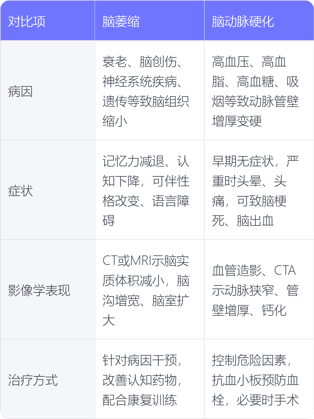 脑萎缩与脑动脉硬化在病因、症状、影像学表现、治疗方式上存在不同。