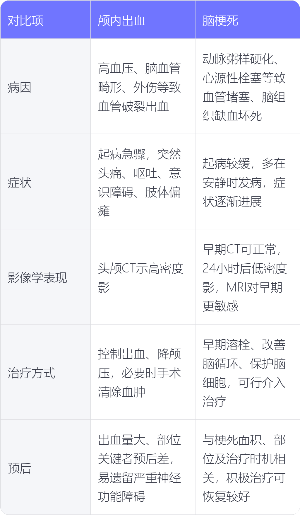 4. 治疗方式:颅内出血治疗以控制出血、降低颅内压、防止并发症为主,必要时手术清除血肿;脑梗死治疗强调早期溶栓、改善脑循环、保护脑细胞等,符合指征者可进行血管内介入治疗。