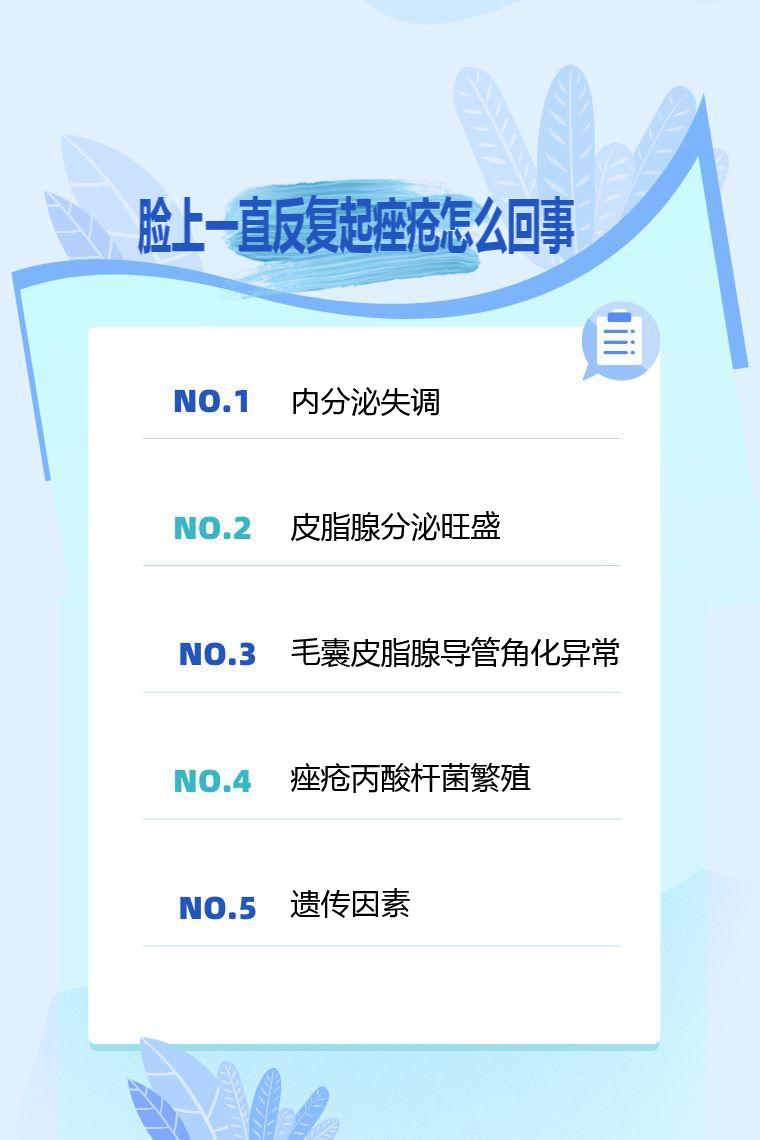 脸上一直反复起痤疮,常见原因有内分泌失调、皮脂腺分泌旺盛、毛囊皮脂腺导管角化异常、痤疮丙酸杆菌繁殖、遗传因素等。