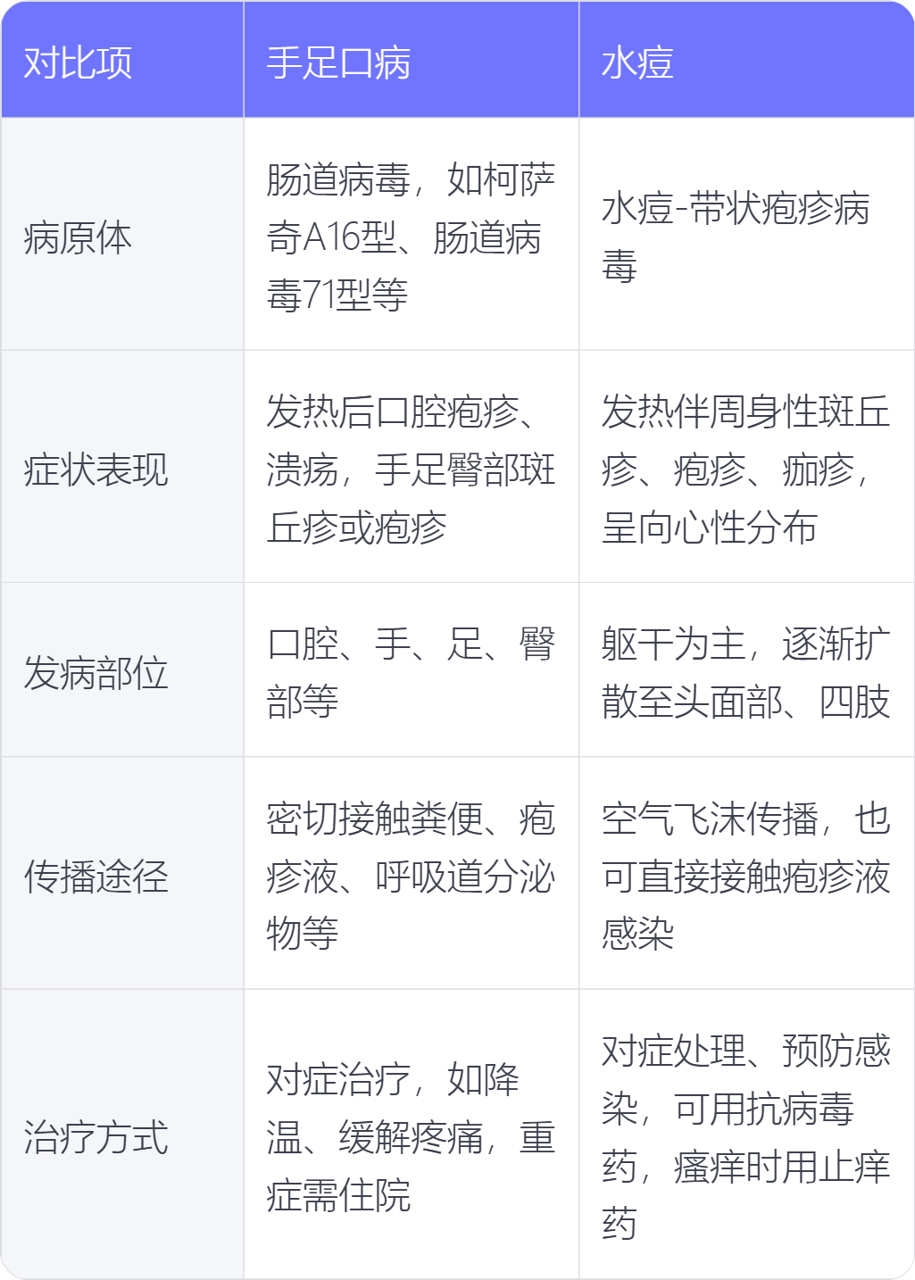 1. 病原体:手足口病由肠道病毒引起,如柯萨奇病毒A16型、肠道病毒71型等;水痘则是由水痘-带状疱疹病毒感染所致。