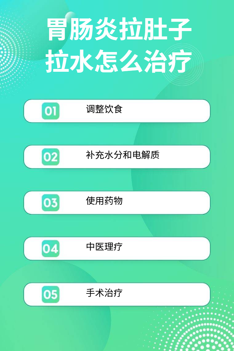 胃肠炎拉肚子拉水可通过调整饮食、补充水分和电解质、使用药物、中医理疗、手术治疗等方法来应对。