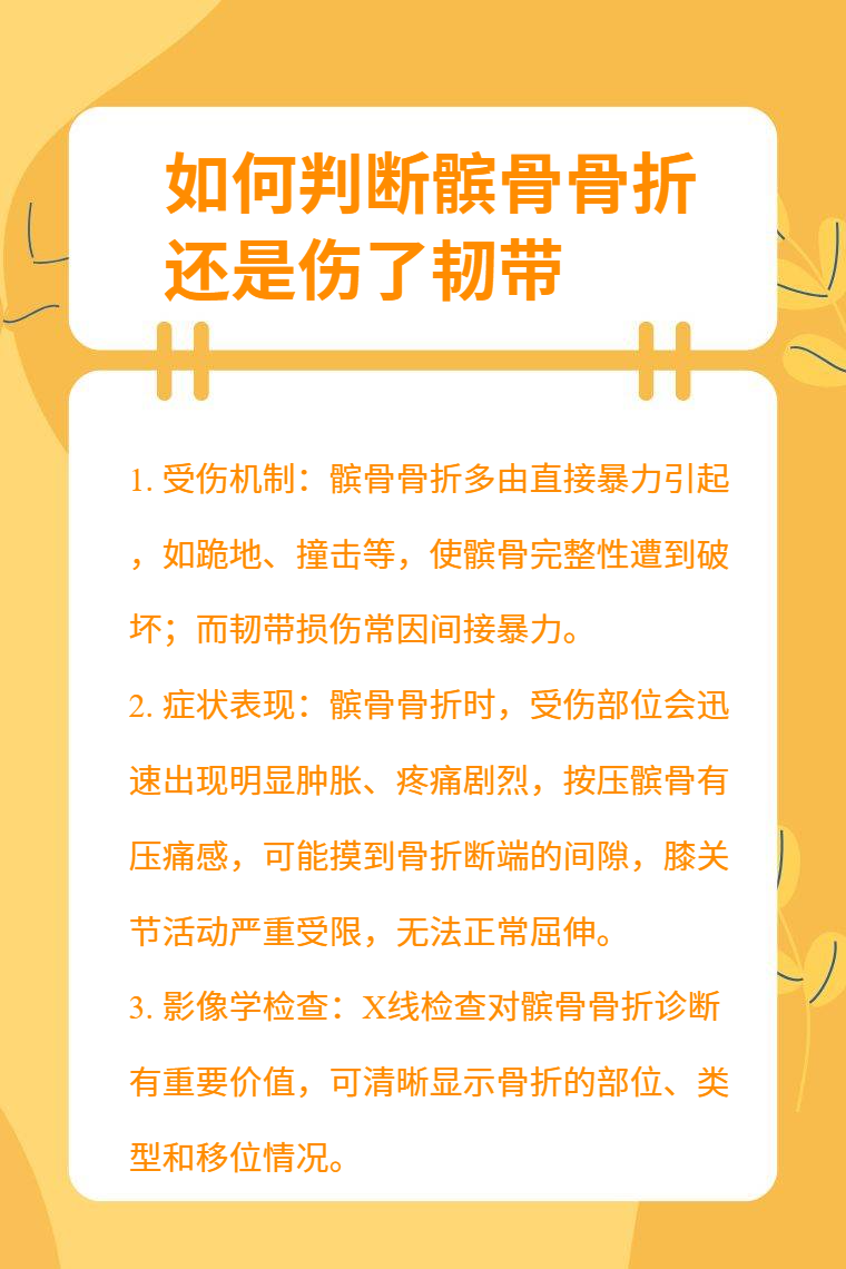 判断髌骨骨折还是伤了韧带可从受伤机制、症状表现、影像学检查等方面入手。