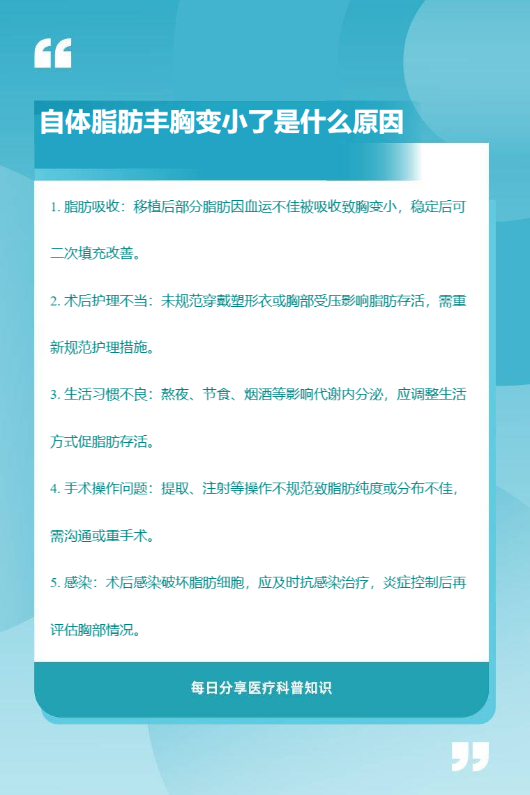 自体脂肪丰胸后变小常见原因有脂肪吸收、术后护理不当、生活习惯不良、手术操作问题、感染等。