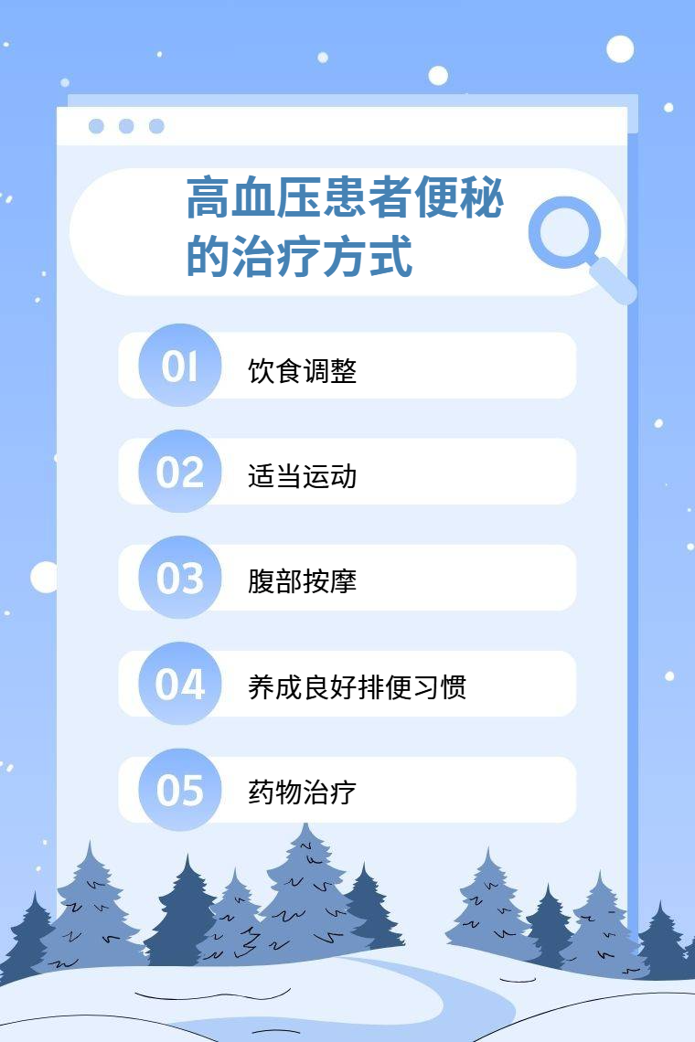 高血压患者便秘的治疗方式包括饮食调整、适当运动、腹部按摩、养成良好排便习惯、药物治疗等。