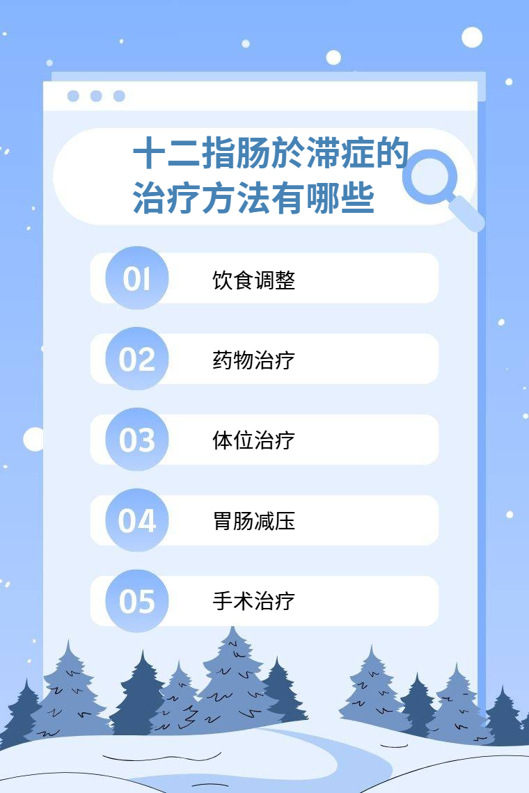 十二指肠淤滞症的治疗方法有饮食调整、药物治疗、体位治疗、胃肠减压、手术治疗等。