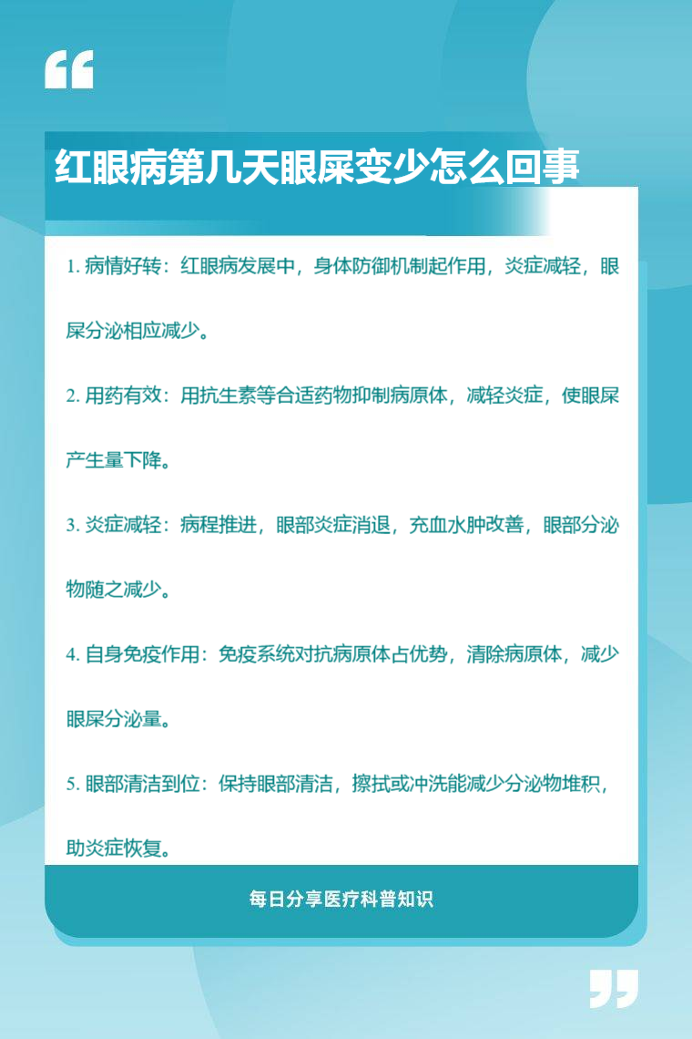 1. 病情好转:红眼病在经过一定病程后,身体自身的防御机制发挥作用,使得病情逐渐朝着好的方向发展,眼部的炎症反应随之减轻,眼屎的分泌量也会相应减少,这是疾病自然转归的一个表现。