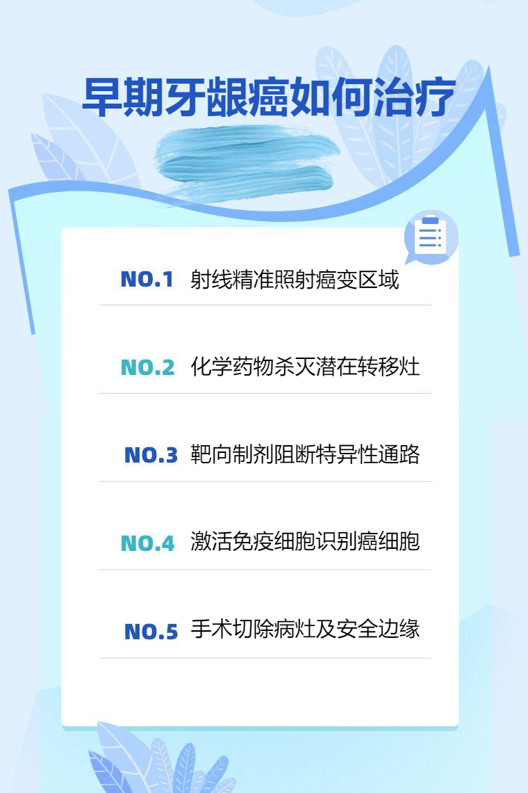 早期牙龈癌的治疗方法主要有放疗、化疗、靶向治疗、免疫治疗、手术治疗等。