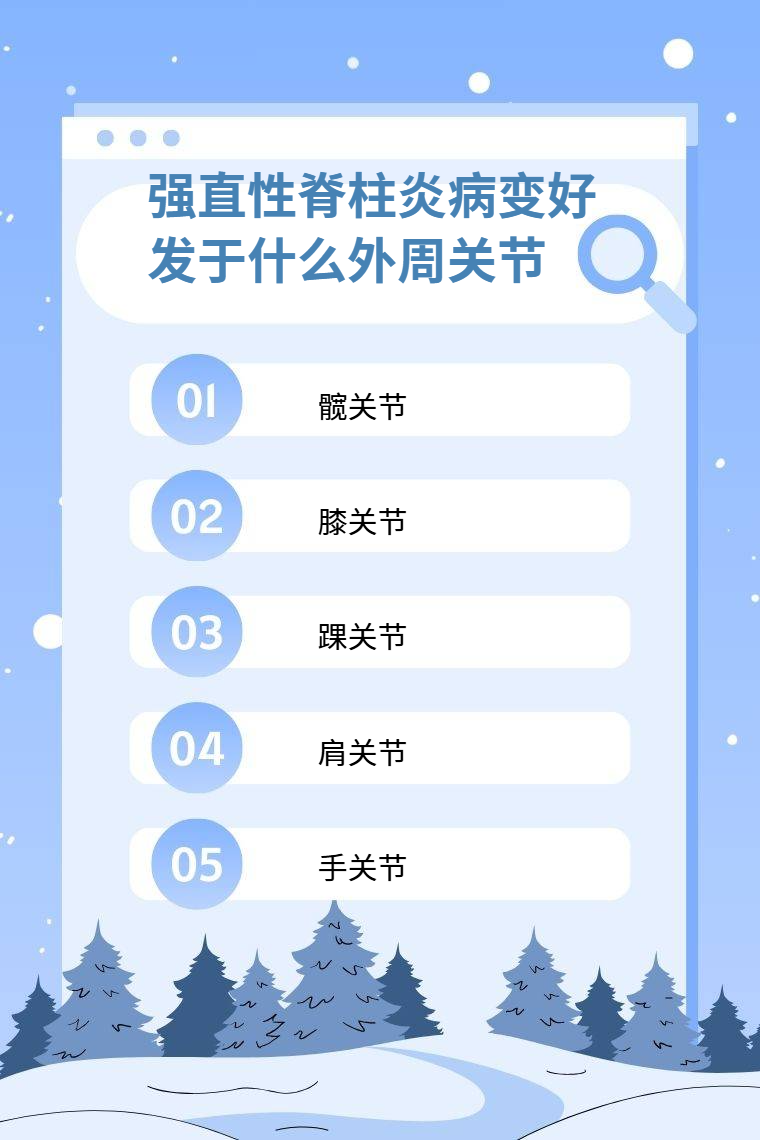 强直性脊柱炎病变好发于髋关节、膝关节、踝关节、肩关节、手关节等外周关节。