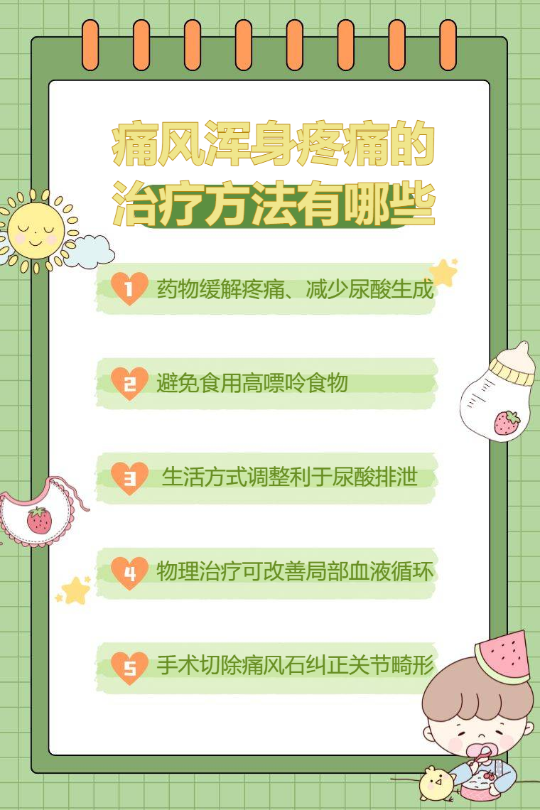 痛风浑身疼痛的治疗方法有药物治疗、饮食控制、生活方式调整、物理治疗、手术治疗等。