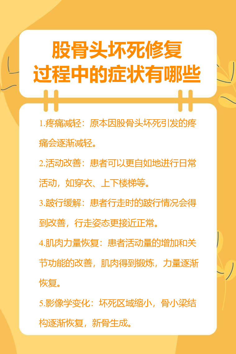 股骨头坏死修复过程中的症状有疼痛减轻、活动改善、跛行缓解、肌肉力量恢复、影像学变化等。