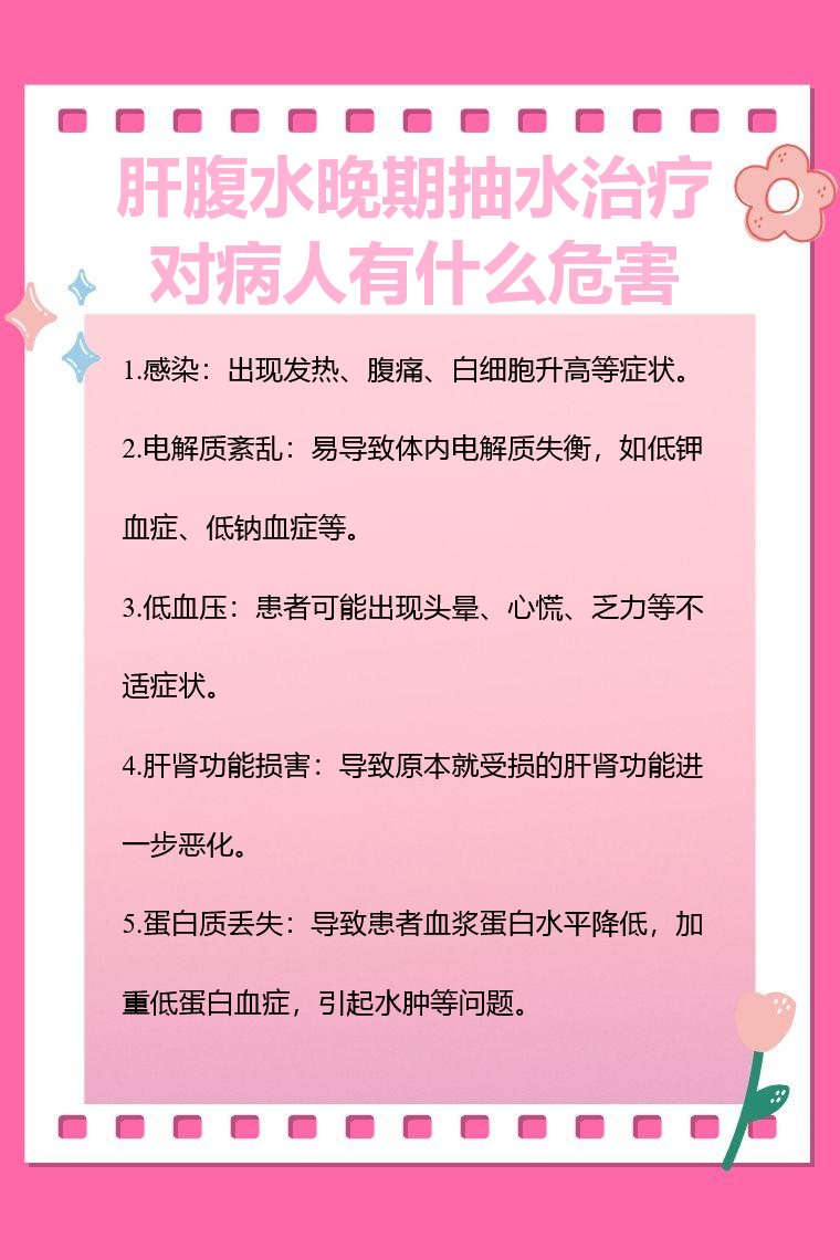 肝腹水晚期抽水治疗可能带来感染、电解质紊乱、低血压、肝肾功能损害、蛋白质丢失等危害。