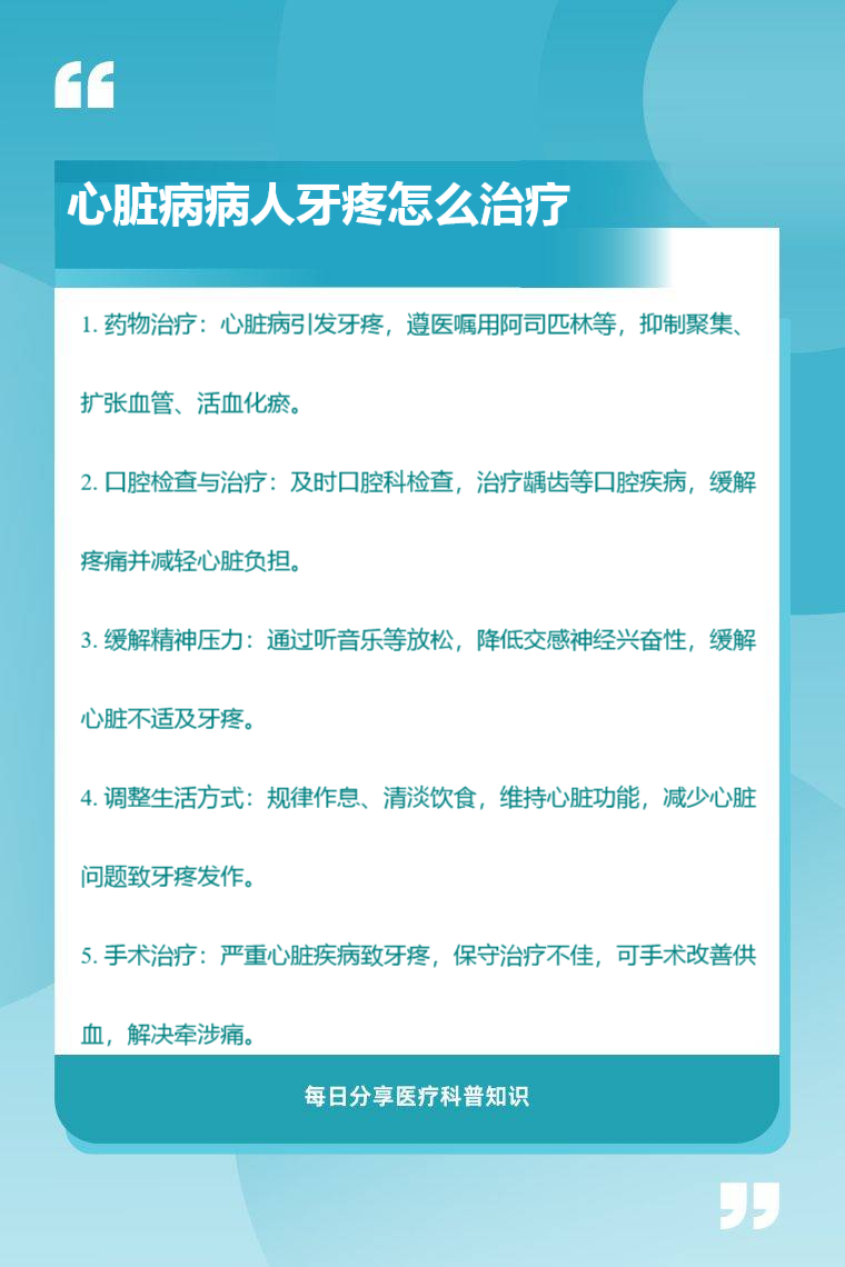 5. 手术治疗:若牙疼是由严重心脏疾病如冠心病等引起,且药物等保守治疗效果不佳,可考虑手术治疗。通过手术改善心脏供血,从根本上解决因心脏问题引发的牵涉痛。