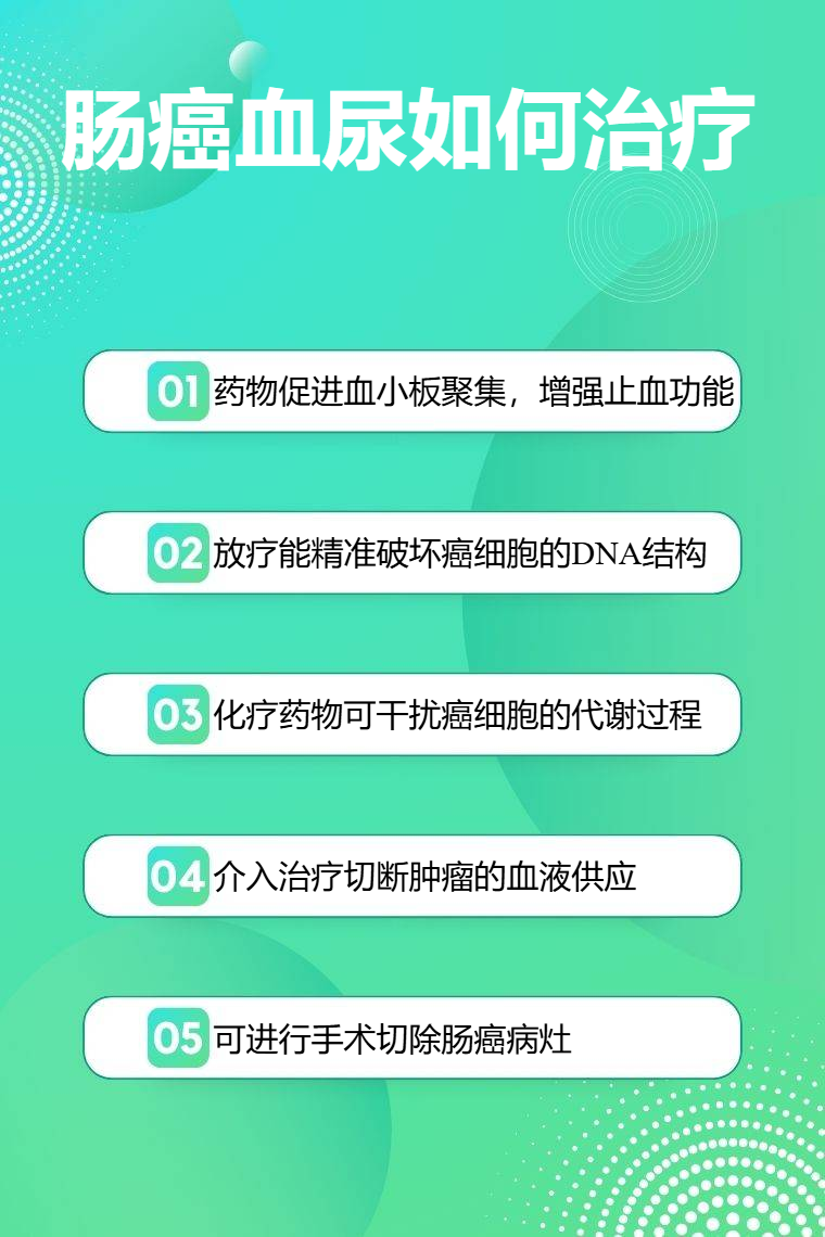 肠癌血尿的治疗方法包括药物治疗、放疗、化疗、介入治疗、手术治疗等。