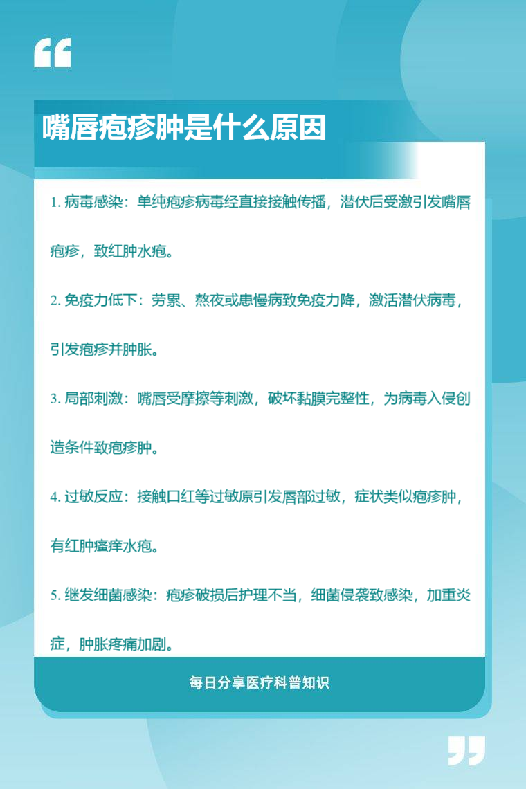 嘴唇疱疹肿常见原因有病毒感染、免疫力低下、局部刺激、过敏反应、继发细菌感染等。