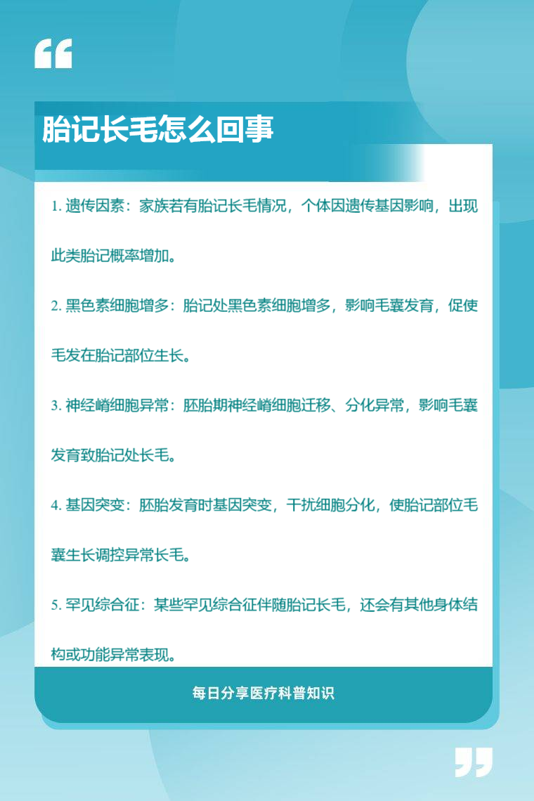 胎记长毛常见原因有遗传因素、黑色素细胞增多、神经嵴细胞异常、基因突变、罕见综合征等。