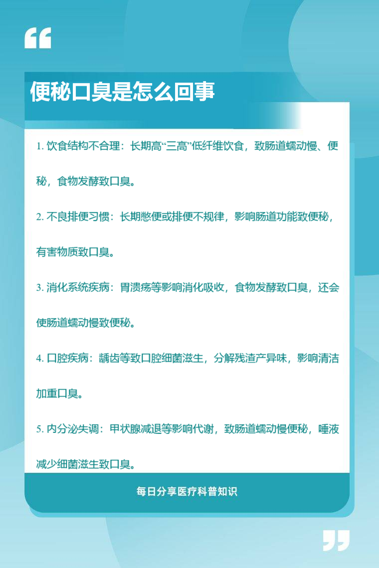 便秘口臭常见原因有饮食结构不合理、不良排便习惯、消化系统疾病、口腔疾病、内分泌失调等。