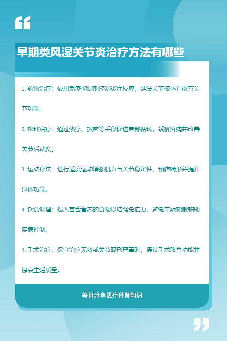 早期类风湿关节炎治疗方法有药物治疗、物理治疗、运动疗法、饮食调理、手术治疗等。