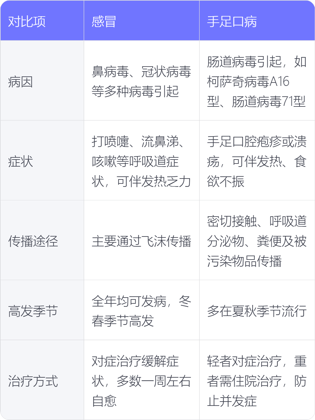 感冒与手足口病在病因、症状、传播途径、高发季节、治疗方式上存在不同。