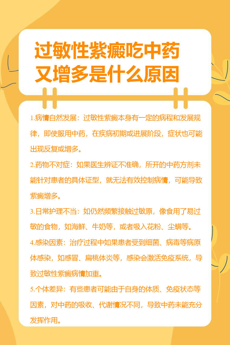过敏性紫癜患者吃中药后增多可能是病情自然发展、药物不对症、日常护理不当、感染因素、个体差异等。