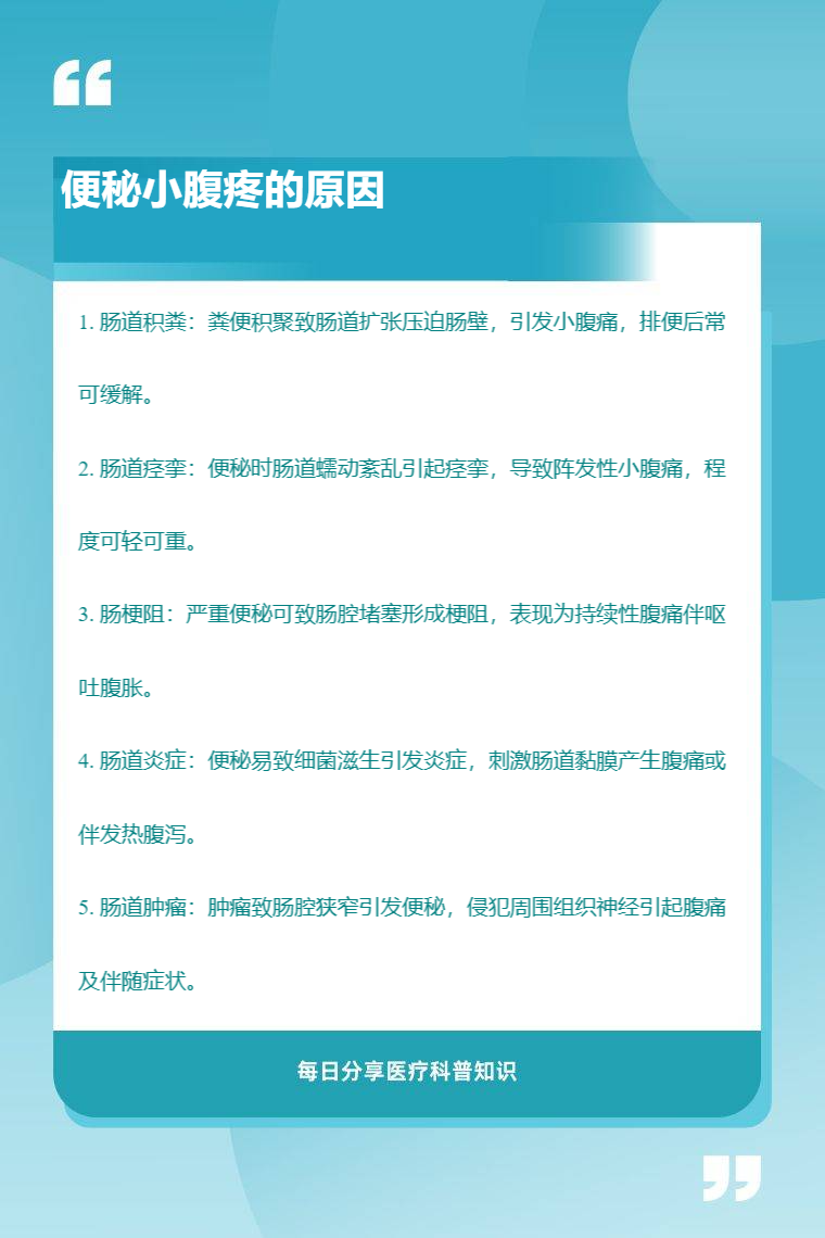 便秘小腹疼的原因主要有肠道积粪、肠道痉挛、肠梗阻、肠道炎症、肠道肿瘤等。