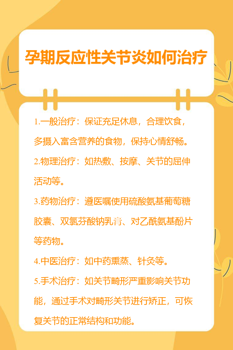 孕期反应性关节炎的治疗方法主要有一般治疗、物理治疗、药物治疗、中医治疗、手术治疗等。