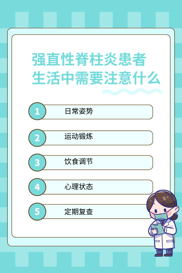 强直性脊柱炎患者生活中需注意日常姿势、运动锻炼、饮食调节、心理状态、定期复查等。