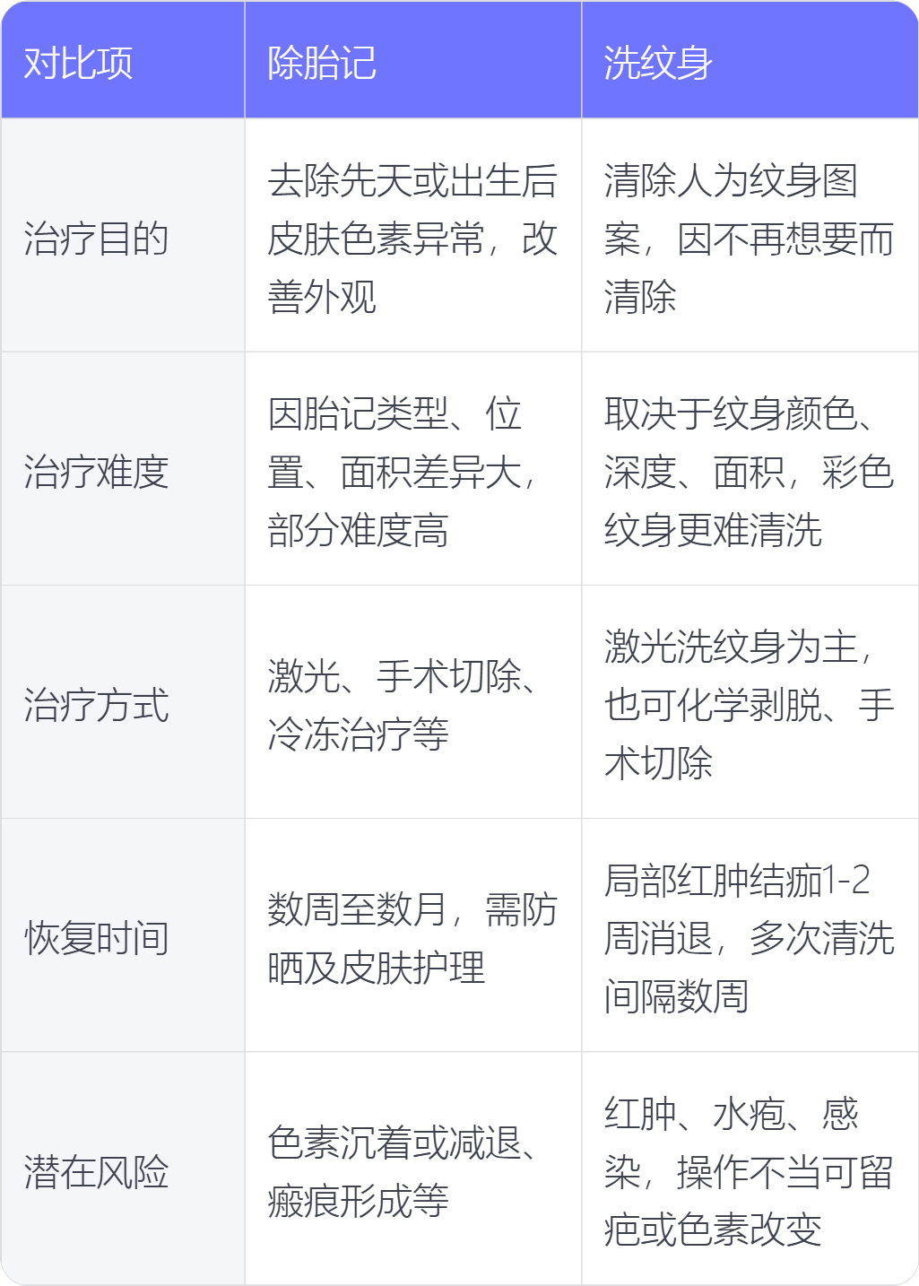 除胎记与洗纹身在治疗目的、治疗难度、治疗方式、恢复时间、潜在风险方面存在不同。