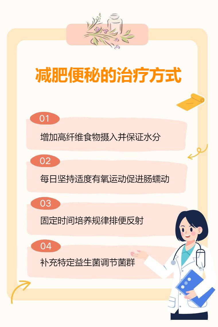 减肥便秘可通过调整饮食结构、增加运动量、培养良好排便习惯、补充益生菌等方式来治疗。