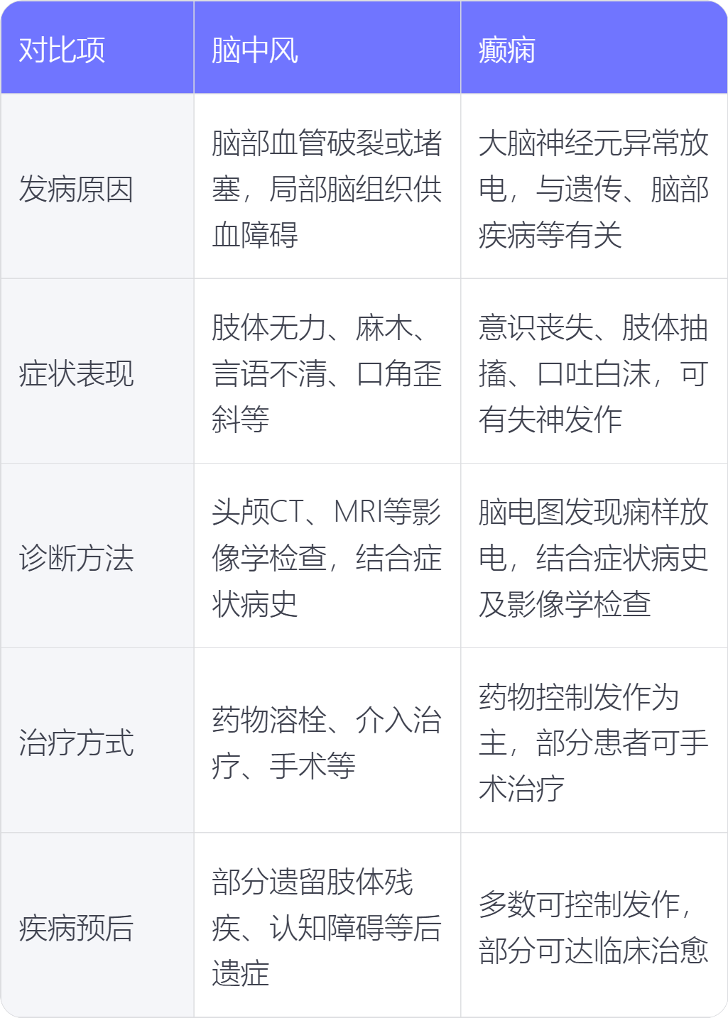 脑中风和癫痫在发病原因、症状表现、诊断方法、治疗方式、疾病预后方面存在不同。