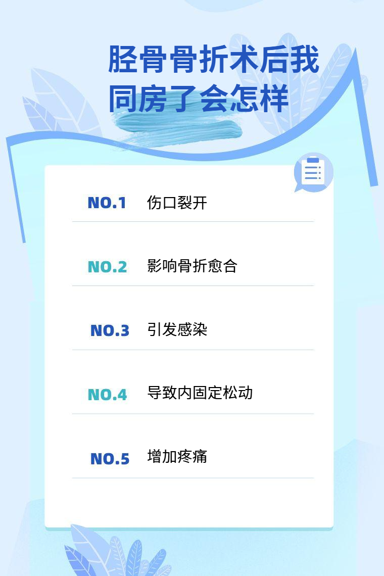 胫骨骨折术后同房可能出现伤口裂开、影响骨折愈合、引发感染、导致内固定松动、增加疼痛等情况。