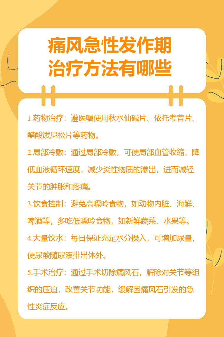 痛风急性发作期治疗方法有药物治疗、局部冷敷、饮食控制、大量饮水、手术治疗等。