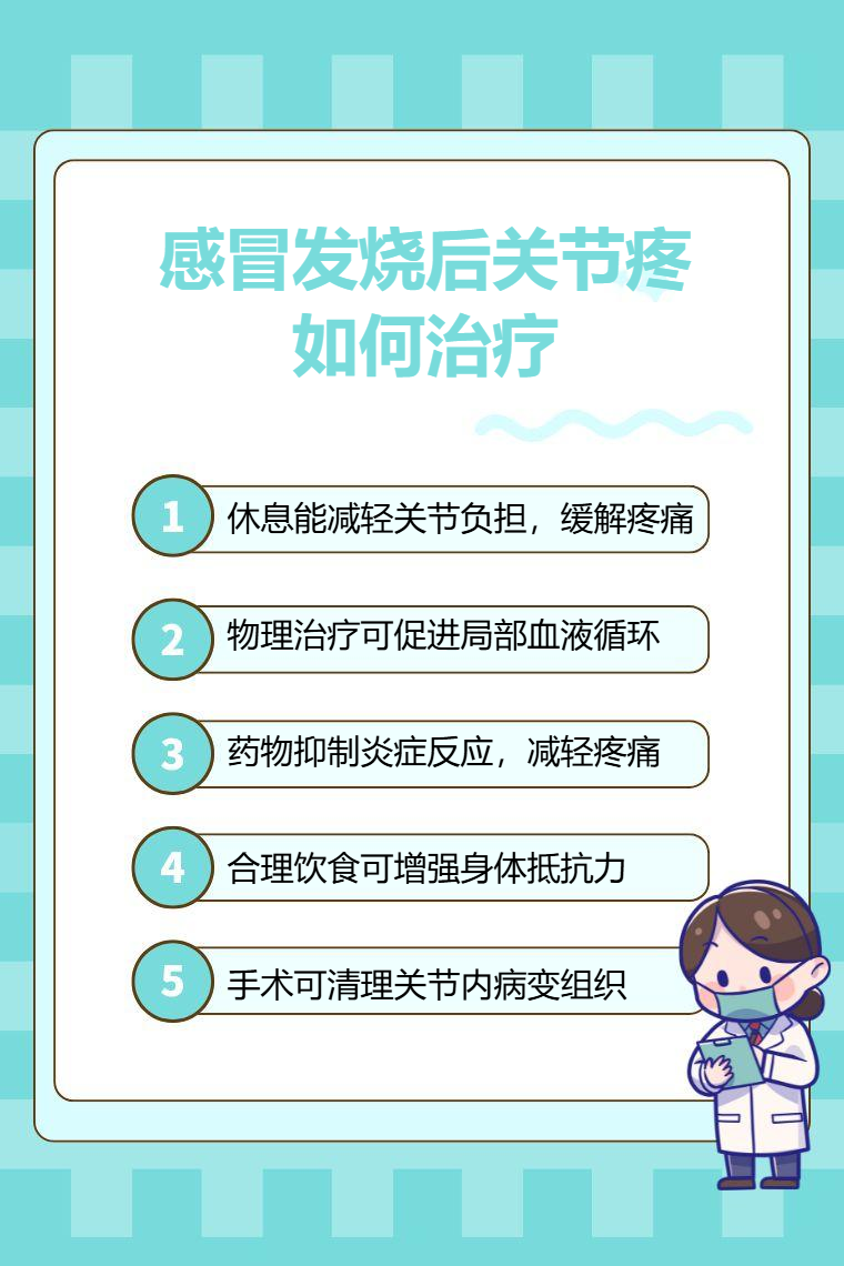 感冒发烧后关节疼可通过休息、物理治疗、药物治疗、饮食调节、手术治疗等方法来缓解和治疗。