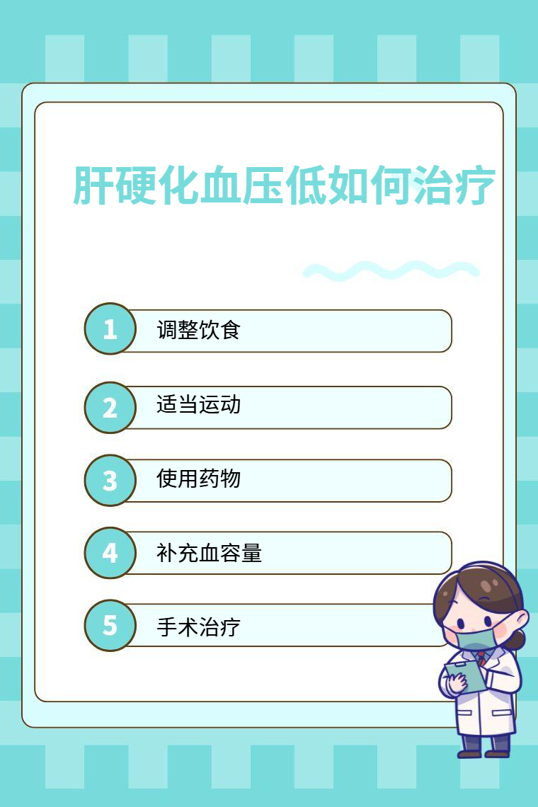 肝硬化血压低可通过调整饮食、适当运动、使用药物、补充血容量、手术治疗等方法进行治疗。