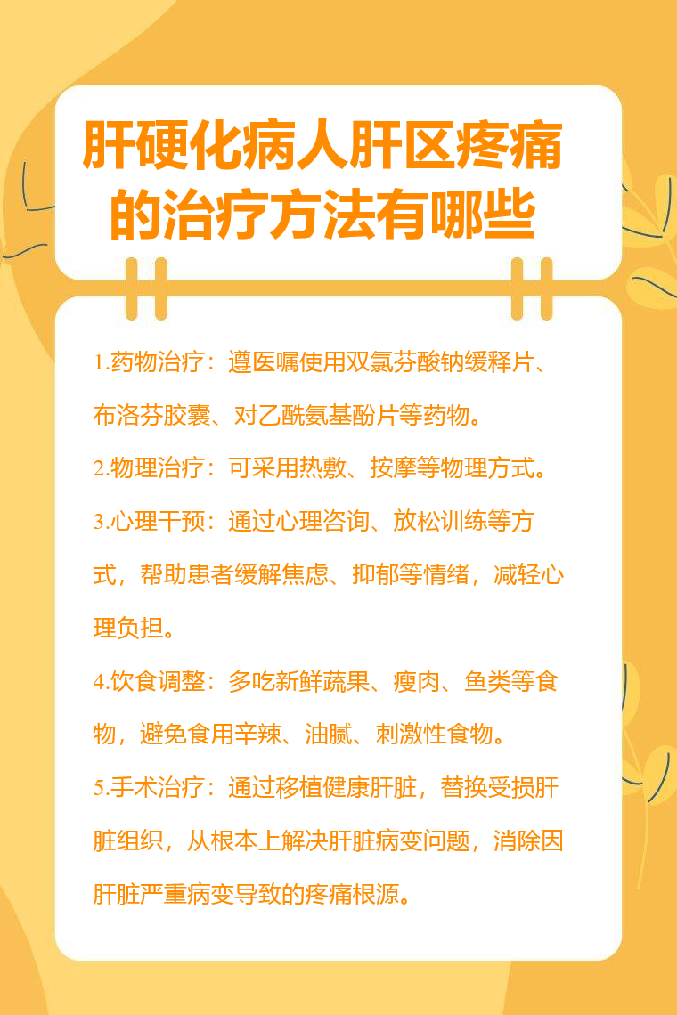 肝硬化病人肝区疼痛的治疗方法有药物治疗、物理治疗、心理干预、饮食调整、手术治疗等。