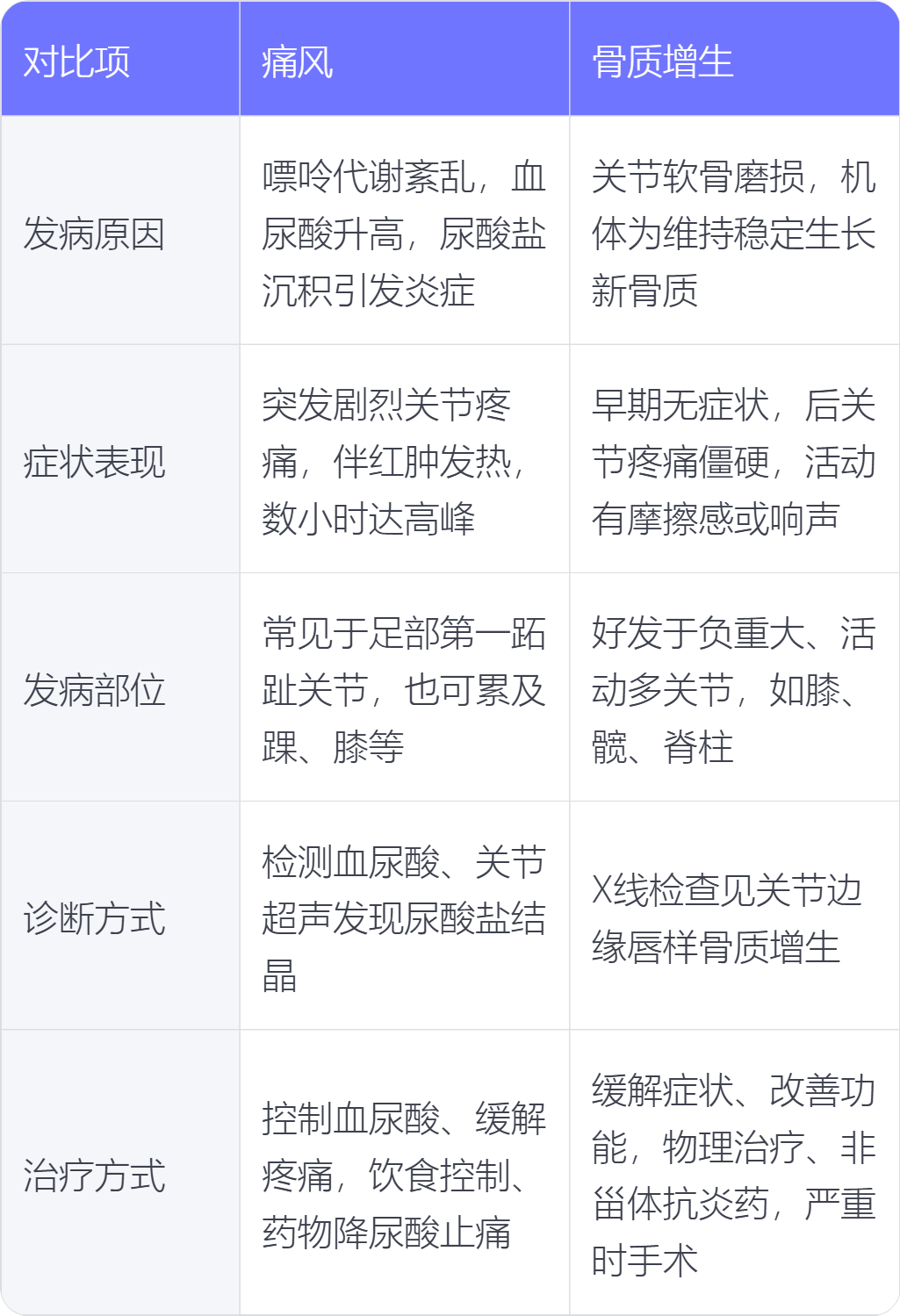 4. 诊断方式:痛风通过检测血尿酸水平、关节超声发现尿酸盐结晶等进行诊断;骨质增生主要依靠X线检查,可发现关节边缘有唇样骨质增生。