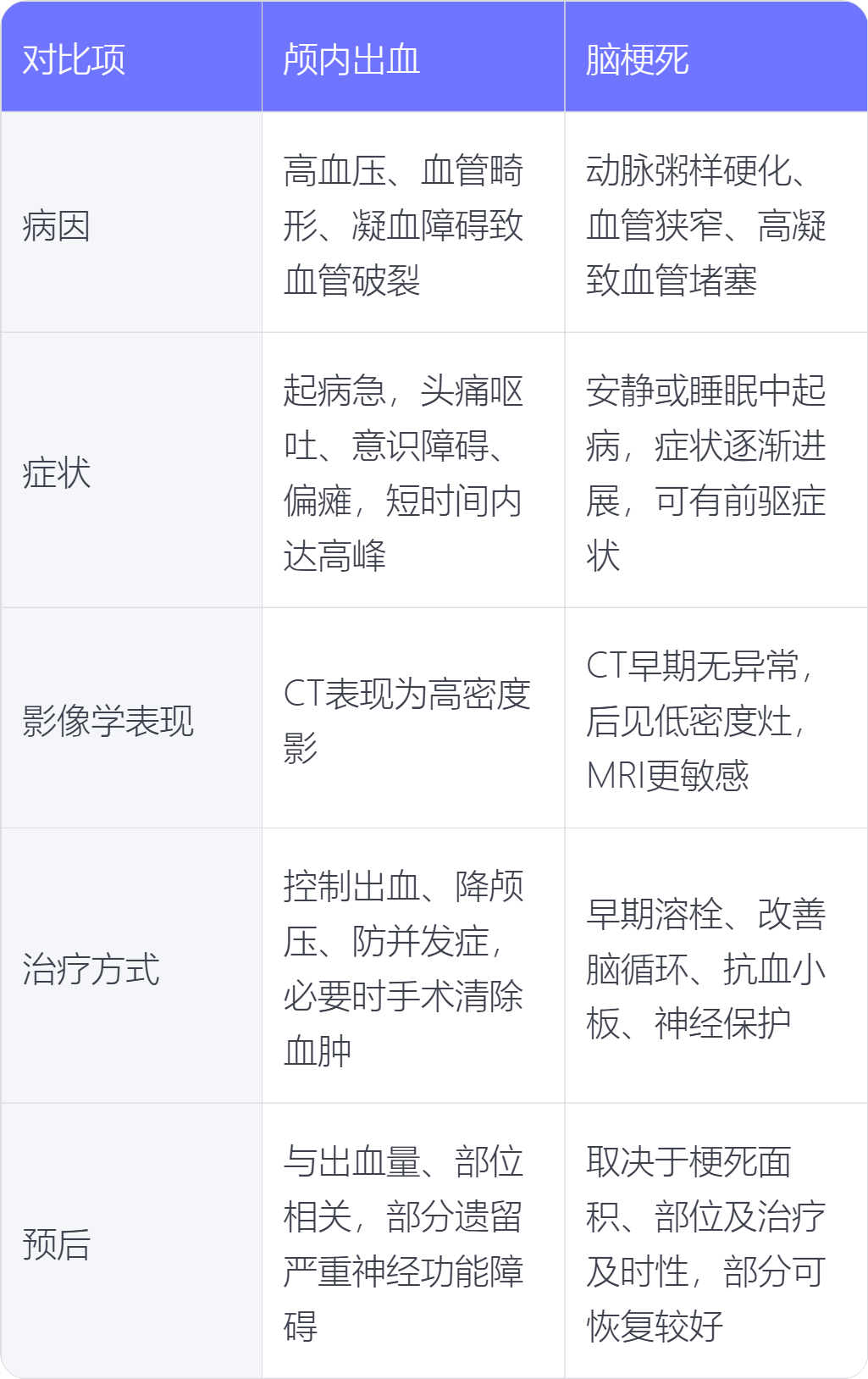 4. 治疗方式:颅内出血治疗以控制出血、降低颅内压、防止并发症为主,必要时手术清除血肿;脑梗死治疗强调早期溶栓、改善脑循环、抗血小板聚集、神经保护等。