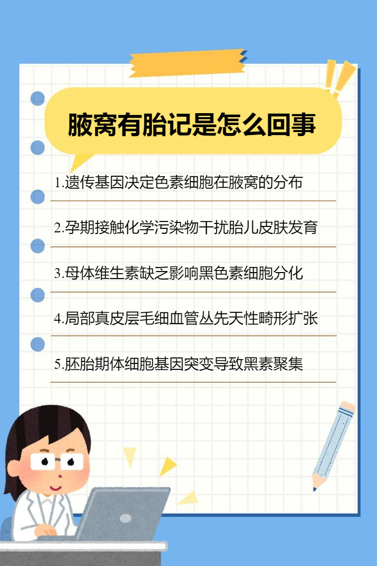 2. 环境因素:外界环境中的多种因素可能影响胎记的出现,如孕期母亲接触到化学物质、辐射等,这些不良环境因素可能干扰胎儿皮肤发育过程,进而导致胎记在腋窝等部位形成。