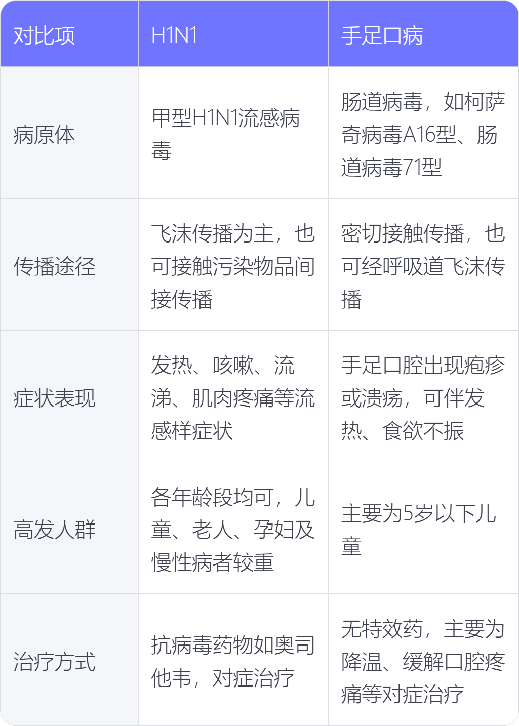 5. 治疗方式:H1N1通常采用抗病毒药物治疗,如奥司他韦等,同时对症治疗缓解症状。手足口病目前没有特效抗病毒药物,主要是对症治疗,如降温、缓解口腔疼痛等。