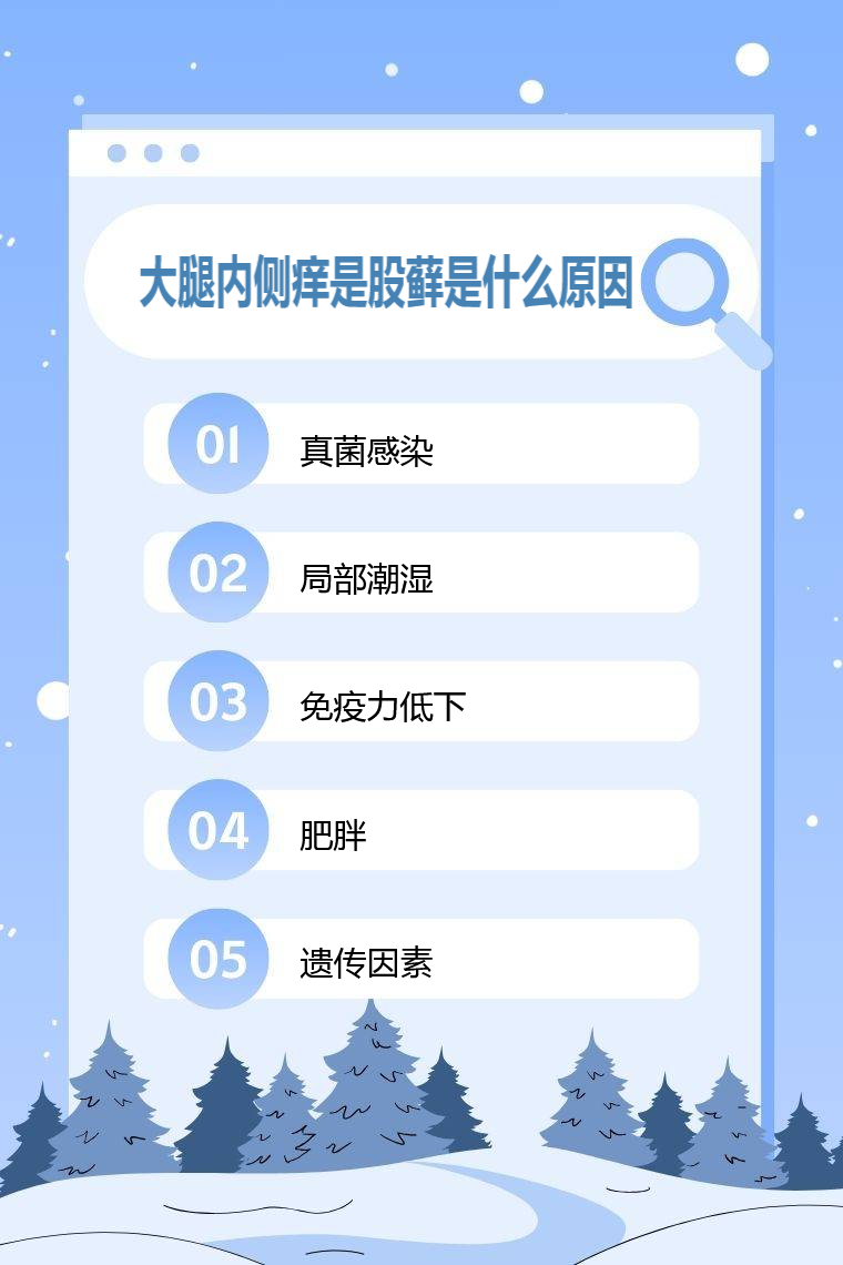 大腿内侧痒是股癣常见原因有真菌感染、局部潮湿、免疫力低下、肥胖、遗传因素等。