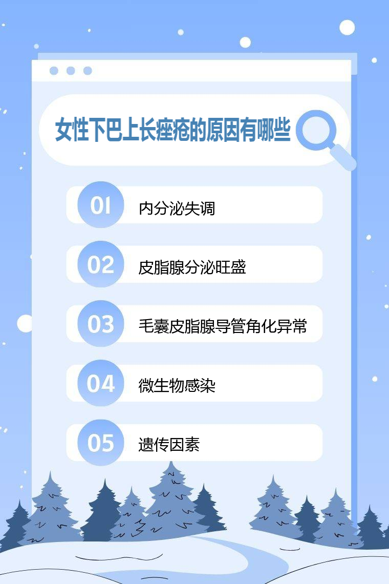女性下巴上长痤疮的原因有内分泌失调、皮脂腺分泌旺盛、毛囊皮脂腺导管角化异常、微生物感染、遗传等。