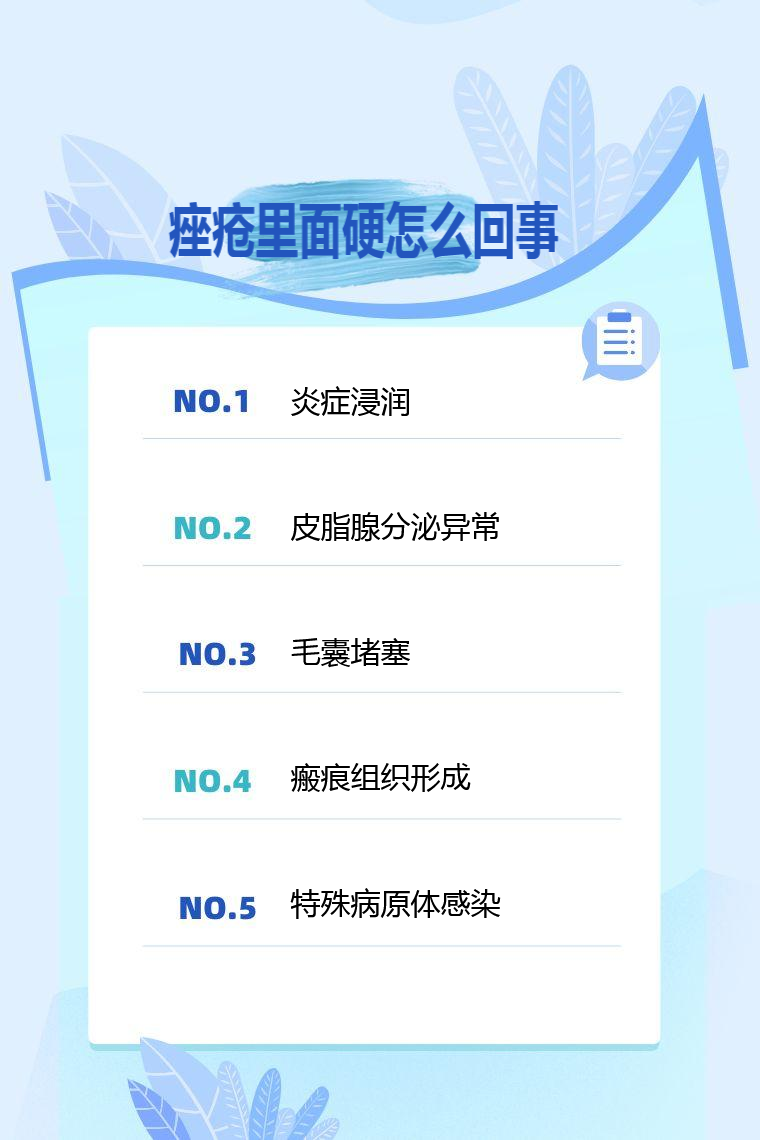 痤疮里面硬可能是由于炎症浸润、皮脂腺分泌异常、毛囊堵塞、瘢痕组织形成、特殊病原体感染等。