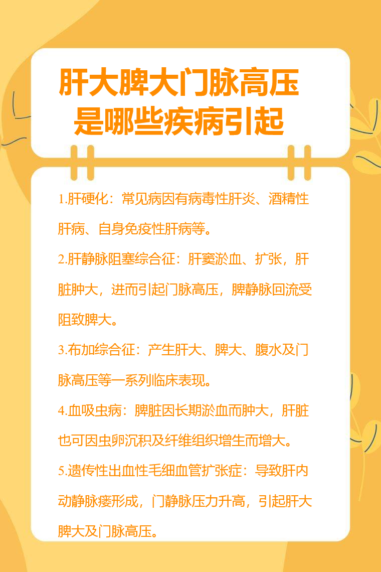 1.肝硬化:各种病因长期作用导致肝脏弥漫性纤维化、假小叶和再生结节形成,正常肝小叶结构被破坏,肝脏血液循环途径改建,门静脉回流受阻,压力升高,进而出现肝大脾大及门脉高压,常见病因有病毒性肝炎、酒精性肝病、自身免疫性肝病等。