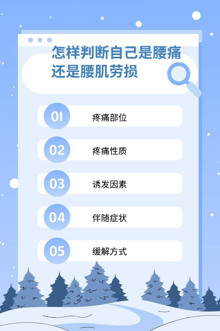 判断自己是腰痛还是腰肌劳损可从疼痛部位、疼痛性质、诱发因素、伴随症状、缓解方式等方面入手。