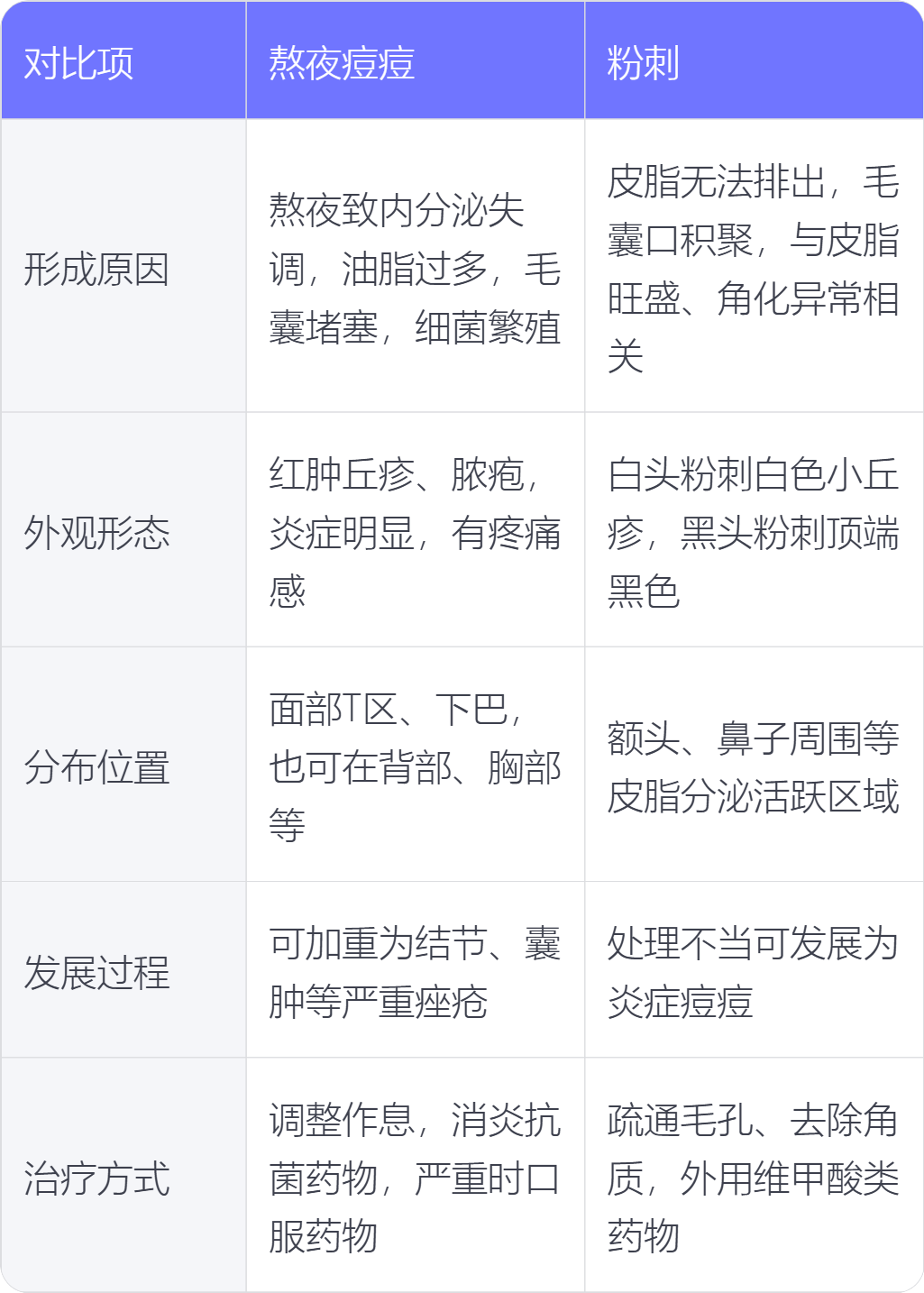 5. 治疗方式:熬夜痘痘治疗需调整作息,同时使用消炎抗菌药物,严重时可能需口服药物;粉刺治疗以疏通毛孔、去除角质为主,可使用外用维甲酸类药物。