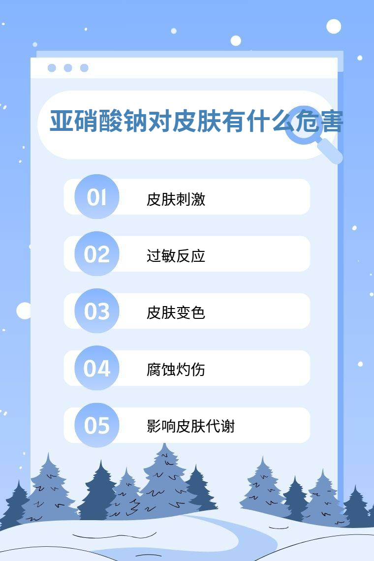 亚硝酸钠对皮肤的危害包括皮肤刺激、过敏反应、皮肤变色、腐蚀灼伤、影响皮肤代谢等。