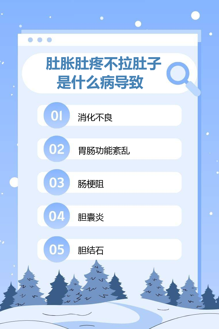肚胀肚疼不拉肚子可能由消化不良、胃肠功能紊乱、肠梗阻、胆囊炎、胆结石等情况导致。
