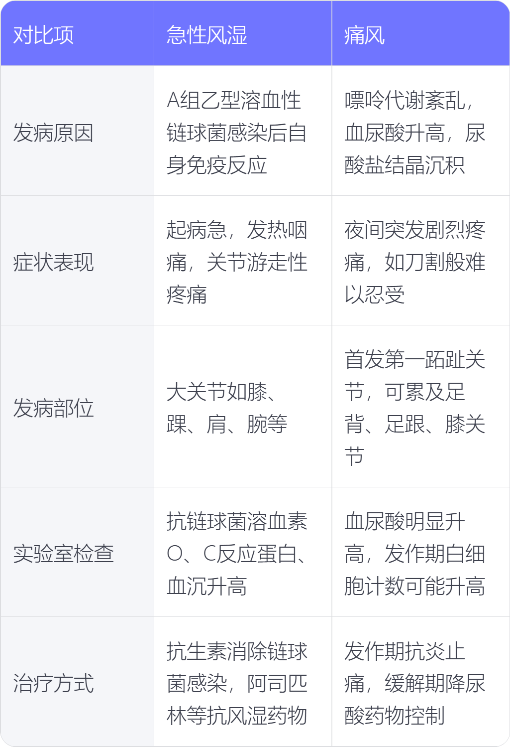急性风湿和痛风在发病原因、症状表现、发病部位、实验室检查、治疗方式上存在不同。